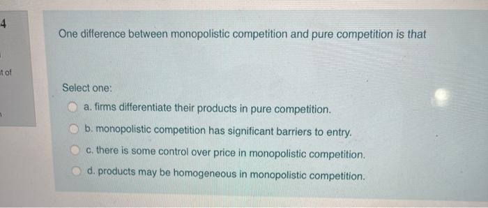 One difference between monopolistic competition and pure competition is that. Products may be homogeneous in monopolistic competition there is some control over price in monopolistic competition monopolistic competition has significant barriers to entry firms differentiate their products in pure competition. In a monopolistic market there is only one firm that dictates the price and supply levels of goods and services.