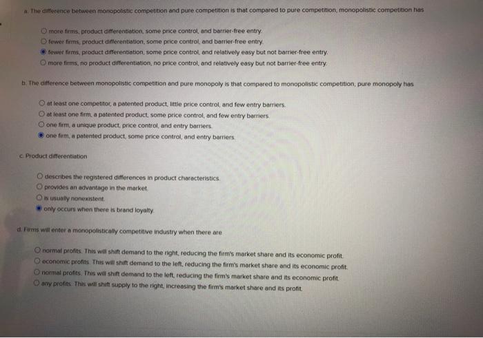 Firms differentiate their products in pure competition. Monopolistic competition has significant barriers to entry D. Mikestarjo6845 is waiting for your help.